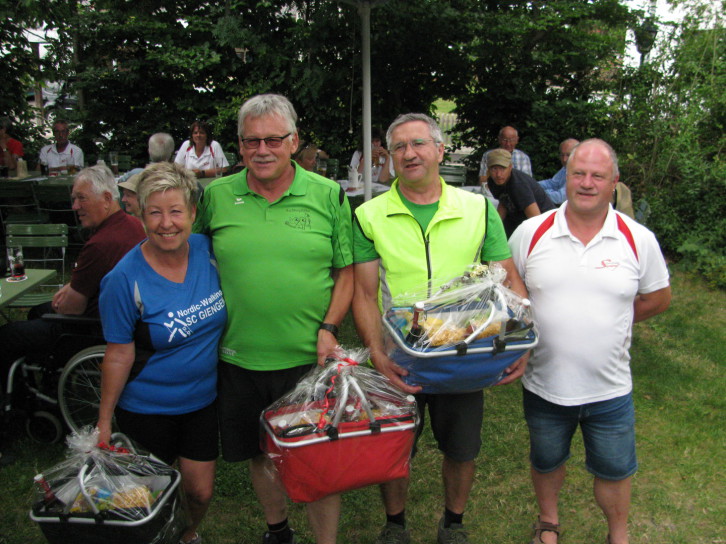 Am Sonntag, den 25. Juni, war Wertingen die dritte Station der Nordic Walking Tour 2017. Die gastgebenden „Zusamläufer“ hatten – wie immer – alles perfekt organisiert, waren aber machtlos gegen Unbekannte, die auf der größeren Runde Tafeln mit den Markierungspfeilen mutwillig entfernt hatten. Zum Glück war es nicht ganz so heiß wie an den vorhergehenden Tagen und so wurden auch die zusätzlichen Kilometer von allen „Irrläufern“ problemlos gemeistert, zumal die zweite Verpflegungsstation dann doch noch erreicht wurde. Reinhard Frank entschuldigte sich nach dem Lauf bei allen Teilnehmern, die das Malheur aber nicht weiter tragisch nahmen und sich im Biergarten vom Gasthof Stark in Gottmannshofen das Mittagessen schmecken ließen. Bei der anschließenden Siegerehrung erhielten die Aschbergfüßler als stärkste Gruppe der insgesamt 48 Teilnehmer (10 Personen) wieder einen schönen Geschenkkorb, aber auch der TSV Wertingen und die Läufer aus Giengen (jeweils 8) durften sich über Preise freuen.